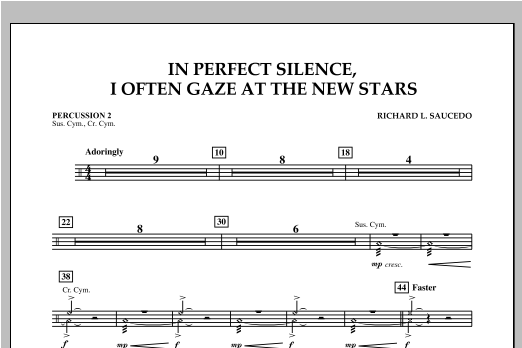 On a Sunday afternoon in May of 2011 tornados devastated the city of Joplin, Missouri. In Perfect Silence, I Often Gaze at the New Stars is intended as a musical tribute to those who lost their lives that day and to those heroes who gave everything they could to help others. The music is a beautiful blending of sounds and moods, and carries with it a full range of emotions from reflective quiet moments to the massive outpouring from the entire ensemble. An evocative and moving work for band that will resonate with both performers and listeners. Dur: 3:50