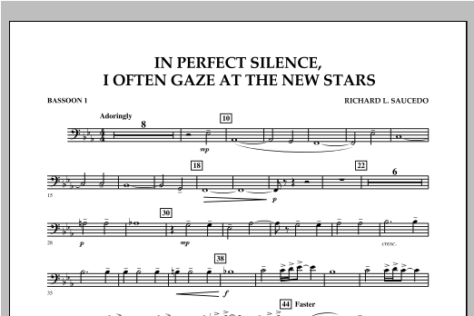 On a Sunday afternoon in May of 2011 tornados devastated the city of Joplin, Missouri. In Perfect Silence, I Often Gaze at the New Stars is intended as a musical tribute to those who lost their lives that day and to those heroes who gave everything they could to help others. The music is a beautiful blending of sounds and moods, and carries with it a full range of emotions from reflective quiet moments to the massive outpouring from the entire ensemble. An evocative and moving work for band that will resonate with both performers and listeners. Dur: 3:50