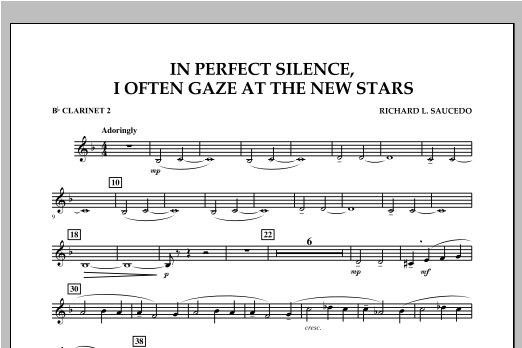 On a Sunday afternoon in May of 2011 tornados devastated the city of Joplin, Missouri. In Perfect Silence, I Often Gaze at the New Stars is intended as a musical tribute to those who lost their lives that day and to those heroes who gave everything they could to help others. The music is a beautiful blending of sounds and moods, and carries with it a full range of emotions from reflective quiet moments to the massive outpouring from the entire ensemble. An evocative and moving work for band that will resonate with both performers and listeners. Dur: 3:50