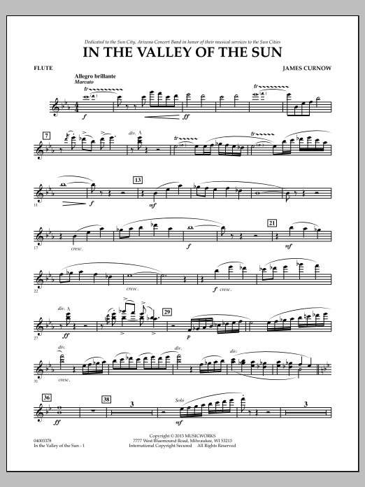 Im Auftrag der Sun City, Arizona Concert Band wurde In the Valley of the Sun in Form einer dreiteiligen Ouvertüre komponiert, die mit einem ausgelassenen und rhythmischen Thema im Western-Stil beginnt. Das langsame Mittelthema beschreibt musikalisch die Schönheit der Wüste von Arizona mit einer fließenden, aber kantigen Melodie. Das Western-Ambiente kehrt zurück und führt das Werk zu einem spannenden und treibenden Abschluss. (Grad 3.5) Dauer: 5:50