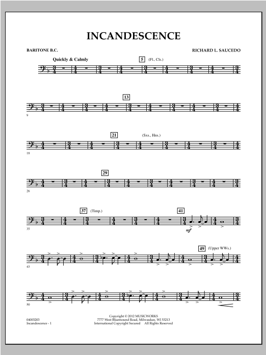 Composed to give young players the opportunity to experience mixed meter in a controlled setting (in this case, 3/4 + 4/4), Incandescence uses an engaging and energetic rhythmic groove to make this big step fun and enjoyable. In addition to being a perfect vehicle for teaching and internalizing a constant 8th- note subdivision, this piece will be exciting and rewarding to perform. Dur: 2:10