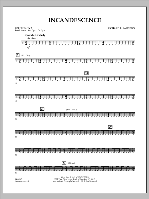 Composed to give young players the opportunity to experience mixed meter in a controlled setting (in this case, 3/4 + 4/4), Incandescence uses an engaging and energetic rhythmic groove to make this big step fun and enjoyable. In addition to being a perfect vehicle for teaching and internalizing a constant 8th- note subdivision, this piece will be exciting and rewarding to perform. Dur: 2:10