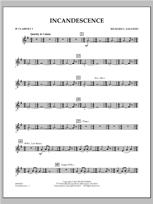 Composed to give young players the opportunity to experience mixed meter in a controlled setting (in this case, 3/4 + 4/4), Incandescence uses an engaging and energetic rhythmic groove to make this big step fun and enjoyable. In addition to being a perfect vehicle for teaching and internalizing a constant 8th- note subdivision, this piece will be exciting and rewarding to perform. Dur: 2:10