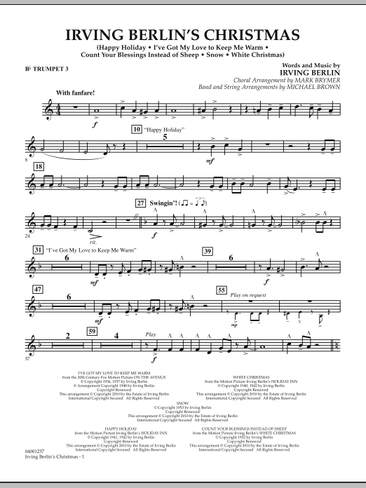 This spectacular setting for choir, band and optional strings of some of Irving Berlin's classic songs offers a variety of entertaining performance options and highlights his most beloved holiday songs. The 7-minute medley includes: Happy Holiday, Snow, I've Got My Love To Keep Me Warm, Count Your Blessings Instead of Sheep, White Christmas.