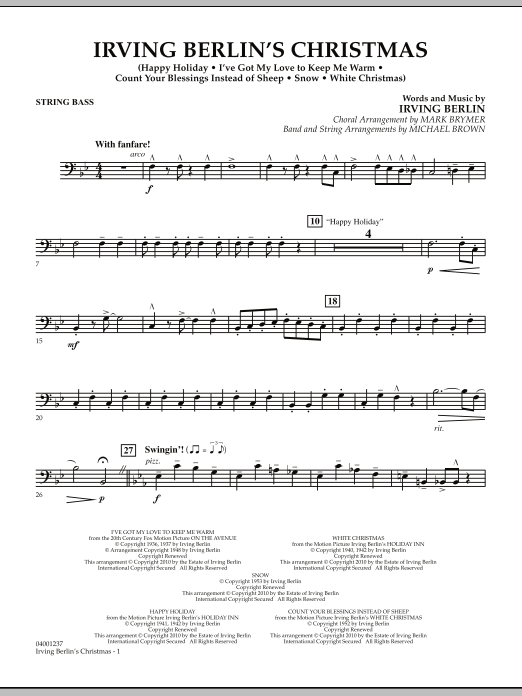 This spectacular setting for choir, band and optional strings of some of Irving Berlin's classic songs offers a variety of entertaining performance options and highlights his most beloved holiday songs. The 7-minute medley includes: Happy Holiday, Snow, I've Got My Love To Keep Me Warm, Count Your Blessings Instead of Sheep, White Christmas.