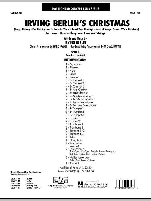 This spectacular setting for choir, band and optional strings of some of Irving Berlin's classic songs offers a variety of entertaining performance options and highlights his most beloved holiday songs. The 7-minute medley includes: Happy Holiday, Snow, I've Got My Love To Keep Me Warm, Count Your Blessings Instead of Sheep, White Christmas.