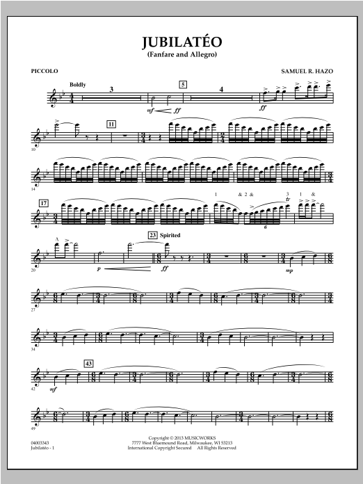 Commissioned for the 100th anniversary of the Calgary Stampede Showband of Calgary, Alberta, Samuel Hazo has created a stunning and inspired work for mature players. The title (taken from the Latin phrase Jubilate Deo) is indicative of the pervading sense of ceremony and jubilation. Bookended with a broad and powerful fanfare, the exuberant allegro section features a spirited pulse with mixed meters and soaring melodies. A dynamic percussion score is inherent throughout the work all the way to the dramatic finish. Dur: 5:00