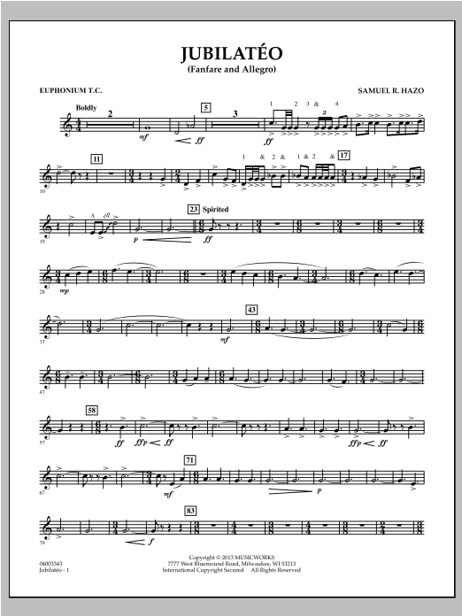 Commissioned for the 100th anniversary of the Calgary Stampede Showband of Calgary, Alberta, Samuel Hazo has created a stunning and inspired work for mature players. The title (taken from the Latin phrase Jubilate Deo) is indicative of the pervading sense of ceremony and jubilation. Bookended with a broad and powerful fanfare, the exuberant allegro section features a spirited pulse with mixed meters and soaring melodies. A dynamic percussion score is inherent throughout the work all the way to the dramatic finish. Dur: 5:00