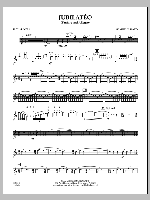 Commissioned for the 100th anniversary of the Calgary Stampede Showband of Calgary, Alberta, Samuel Hazo has created a stunning and inspired work for mature players. The title (taken from the Latin phrase Jubilate Deo) is indicative of the pervading sense of ceremony and jubilation. Bookended with a broad and powerful fanfare, the exuberant allegro section features a spirited pulse with mixed meters and soaring melodies. A dynamic percussion score is inherent throughout the work all the way to the dramatic finish. Dur: 5:00