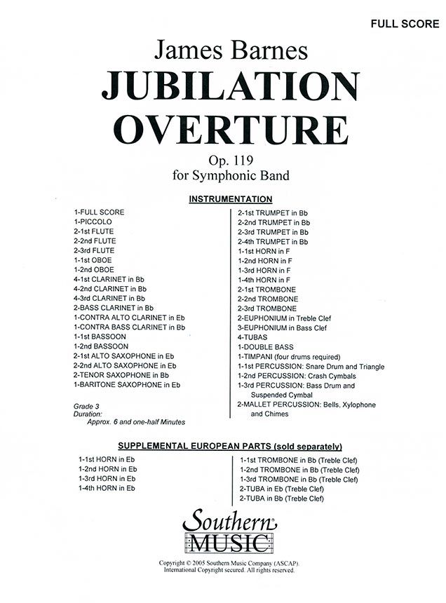 This work was written to celebrate the 150th anniversary of the founding of the city of Lawrence, Kansas, home to composer James Barnes for years. Like all Barnes scores, Jubilation Overture is a model of craft in band composition.