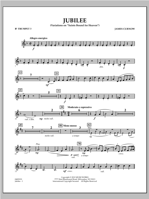 Based on the shaped note melody Saints Bound For Heaven, Jubilee by James Curnow captures a feeling of joyful celebration through a series of unique and skillfully adapted variations. The opening strains are actually fragments of the first variation and occur before the main tune is introduced by low brass and woodwinds. The second variation features a euphonium solo and builds to a glorious climax with the full ensemble. The final variation is joyful and filled with energy, using flourishes in the woodwinds and fanfares in the brass for a grand conclusion to this marvelous work. (Grade 3.5). Dur: 5:30.