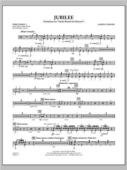 Based on the shaped note melody Saints Bound For Heaven, Jubilee by James Curnow captures a feeling of joyful celebration through a series of unique and skillfully adapted variations. The opening strains are actually fragments of the first variation and occur before the main tune is introduced by low brass and woodwinds. The second variation features a euphonium solo and builds to a glorious climax with the full ensemble. The final variation is joyful and filled with energy, using flourishes in the woodwinds and fanfares in the brass for a grand conclusion to this marvelous work. (Grade 3.5). Dur: 5:30.