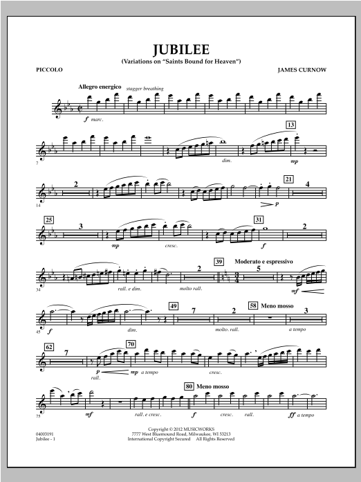 Based on the shaped note melody Saints Bound For Heaven, Jubilee by James Curnow captures a feeling of joyful celebration through a series of unique and skillfully adapted variations. The opening strains are actually fragments of the first variation and occur before the main tune is introduced by low brass and woodwinds. The second variation features a euphonium solo and builds to a glorious climax with the full ensemble. The final variation is joyful and filled with energy, using flourishes in the woodwinds and fanfares in the brass for a grand conclusion to this marvelous work. (Grade 3.5). Dur: 5:30.
