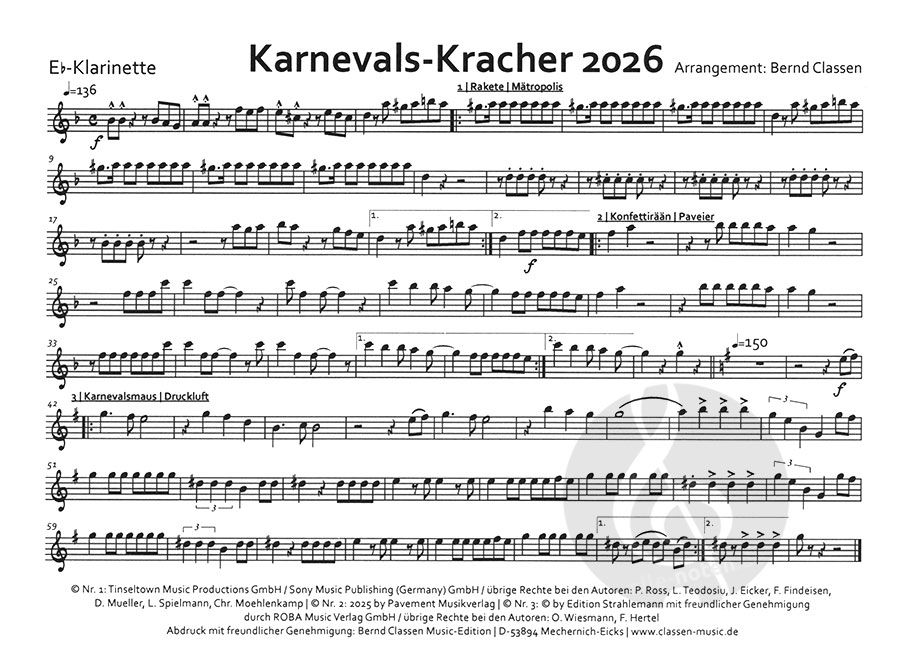 Bernd Classen arrangierte ein gut spielbares Medley, das sowohl in den Straßenkarneval als auch natürlich in jede Sitzung und auf jede Party passt!