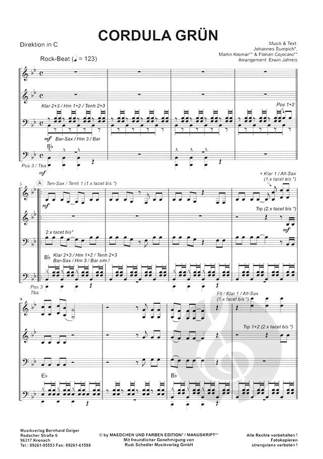 Kleine Blasmusik ist auch für Big Band geeignet und umfasst Direktion in C Es-Klarinette Klarinette 1 in B Klarinette 2 in B Alt Saxofon in Es Tenor-Saxofon in B Flügelhorn 1 in B Flügelhorn 2 in B To...