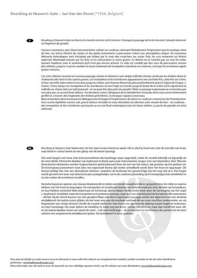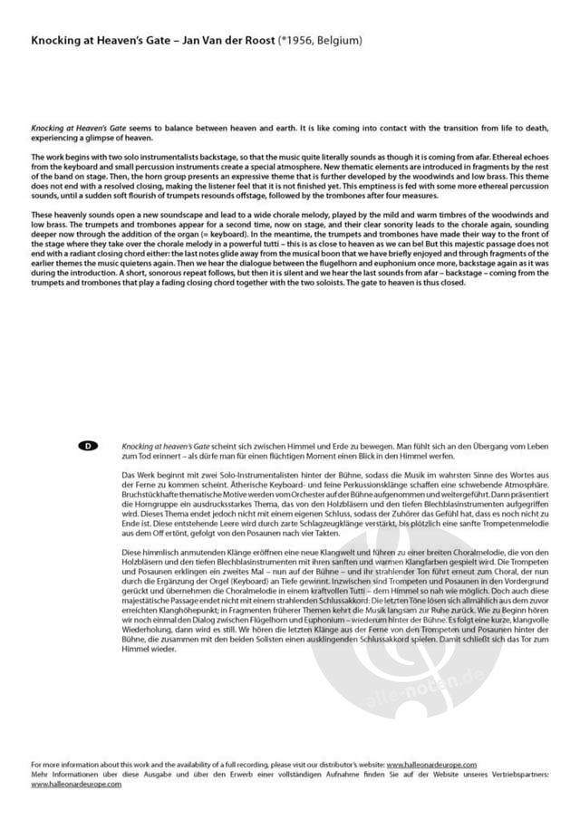 Knocking at Heaven's Gate bringt uns über die Musik kurz mit dem Himmel in Kontakt. In dem Stück gibt es wunderschöne Soli für Euphonium und Flügelhorn, und auch die Trompeten und Posaunen spielen eine wichtige Rolle, doch das Stück bereitet auch dem gesamten Orchester viel Freude! Ätherische Echos, ausdrucksstarke Melodien, kraftvolle Tuttis und strahlende Akkorde: Es gibt viele schöne Momente, sowohl für die Musiker als auch für das Publikum.