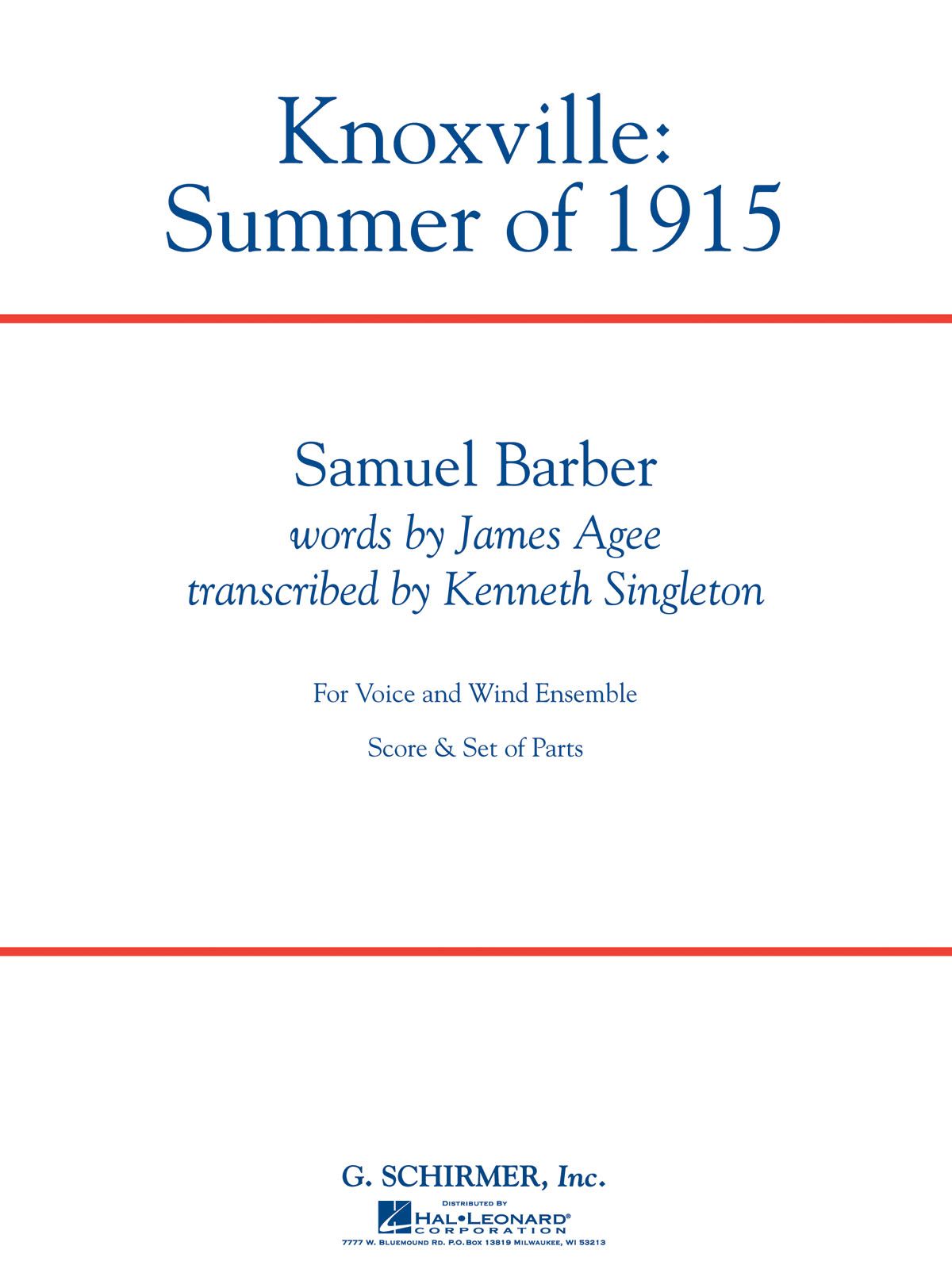 G. Schirmer Concert Band - Grade 3-5 Samuel Barber's landmark 1948 piece for soprano and orchestra, a setting of poetic, nostalgic prose by James Agee, has been transcribed for soprano and concert band in this new edition, making it accessible to many more performers. This lyrical, warm music is Samuel Barber at his best, evoking the highest aspects of Americana. The soprano part is for an accomplished performer. (Grade 5) (15:00)