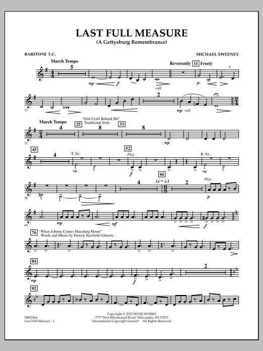 Commemorating the 150th anniversary of the Battle of Gettysburg, this medley of Civil War-era tunes is cast in a unique and appealing setting for young bands. The Girl I Left Behind Me (tin whistles are optional), When Johnny Comes Marching Home and the tender Johnny Has Gone for a Soldier express longing and hope for loved ones far away. In contrast, Battle Cry of Freedom and Battle Hymn of the Republic inspire feelings of patriotic resolve and courage. A rousingly effective work! (Grade 2.5) Dur: 5:10