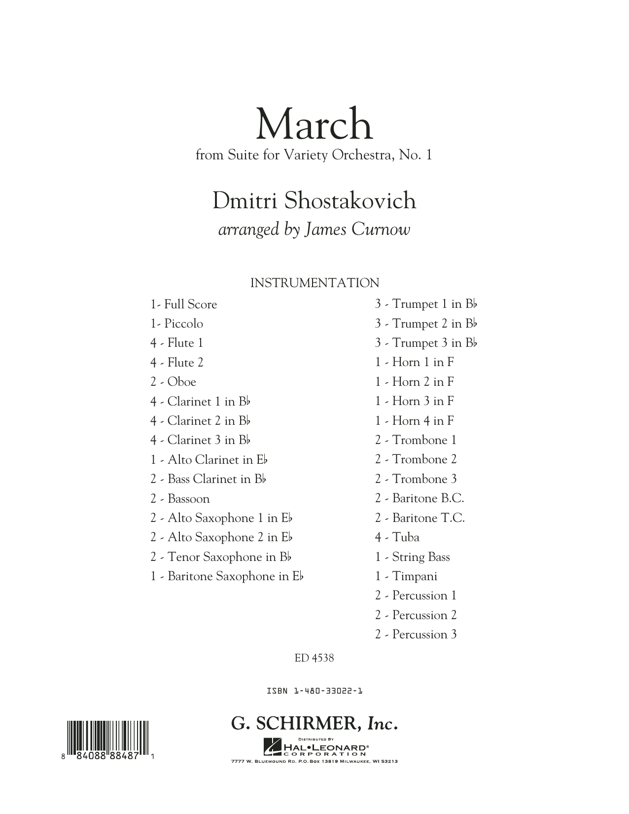 The Suite for Variety Orchestra, No. 1 (1956) is a work by Dmitri Shostakovich in eight movements that draw from the composer's earlier themes. The first of these movements is the delightful 'March' originally found in Korzinkina's Adventures, Op. 59 from 1940. James Curnow has skillfully adapted this work for band, sure to become a welcome addition to the repertoire for winds.