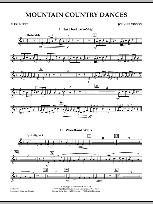Inspiriert von der musikalischen Tradition früher amerikanischer Volkslieder hat Johnnie Vinson diese ansprechende Suite mit drei kontrastierenden Tanzstilen komponiert. Zu den Sätzen gehören Tar Heel Two-Step, Woodland Waltz und Blue Ridge Reel. Sicherlich ein unterhaltsames und lohnendes Werk für junge Bands. (Grad 2.5) Dauer: 5:15
