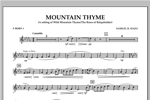 Written as a memorial, this beautifully emotional setting is a reworking of the traditional folk song The Braes of Baquhidder (also known as Wild Mountain Thyme) by Scottish writer Robert Tannahill. Samuel Hazo uses a varied tapestry of colors, textures and dynamics, taking full advantage of the depth and power of the modern wind band in creating this stunningly effective work. Dur: 4:20