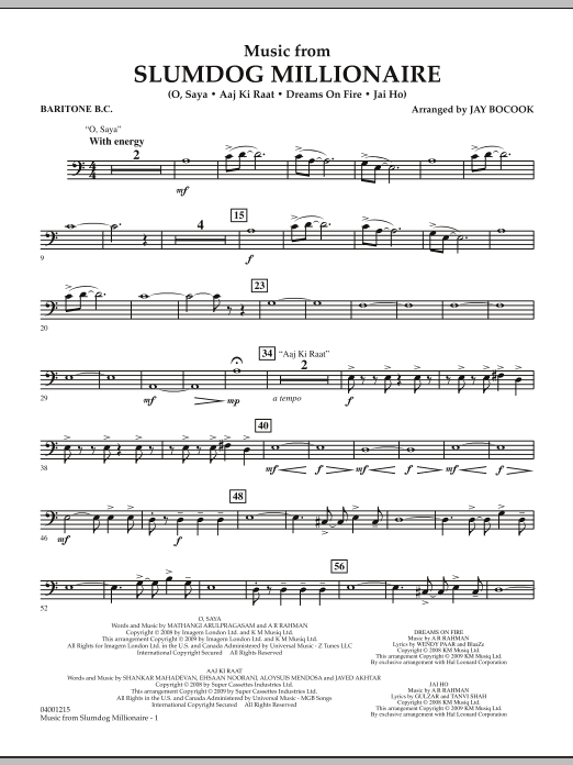 Winner of the 2009 Academy Award for Best Picture, Best Original Score, and numerous other awards, this movie took the country by storm. The driving soundtrack of A. R. Rahman played a major part in bringing this powerful and uplifting story to the silver screen. A terrific setting for band that includes the hit song 'Jai Ho!' Dur: 4:45