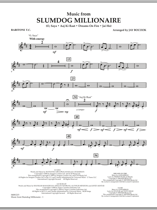 Winner of the 2009 Academy Award for Best Picture, Best Original Score, and numerous other awards, this movie took the country by storm. The driving soundtrack of A. R. Rahman played a major part in bringing this powerful and uplifting story to the silver screen. A terrific setting for band that includes the hit song 'Jai Ho!' Dur: 4:45
