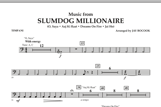 Winner of the 2009 Academy Award for Best Picture, Best Original Score, and numerous other awards, this movie took the country by storm. The driving soundtrack of A. R. Rahman played a major part in bringing this powerful and uplifting story to the silver screen. A terrific setting for band that includes the hit song 'Jai Ho!' Dur: 4:45