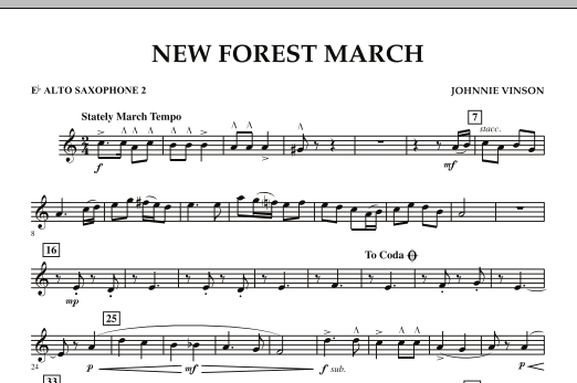 Here is a terrific march for young players written in the traditional British style. The opening strains are folk-like in nature with underlying modal harmonies, while the stately trio is reminiscent of the processional style of Elgar and other British composers. The New Forest refers to a region in southern England established as a royal hunting preserve by William the Conqueror around the year 1079, which has remained largely unchanged since ancient times. Dur: 2:10 (Grade 2)