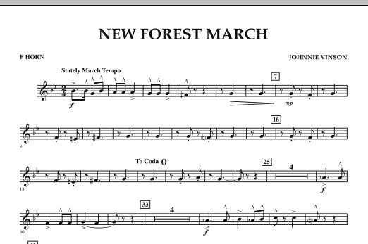 Here is a terrific march for young players written in the traditional British style. The opening strains are folk-like in nature with underlying modal harmonies, while the stately trio is reminiscent of the processional style of Elgar and other British composers. The New Forest refers to a region in southern England established as a royal hunting preserve by William the Conqueror around the year 1079, which has remained largely unchanged since ancient times. Dur: 2:10 (Grade 2)