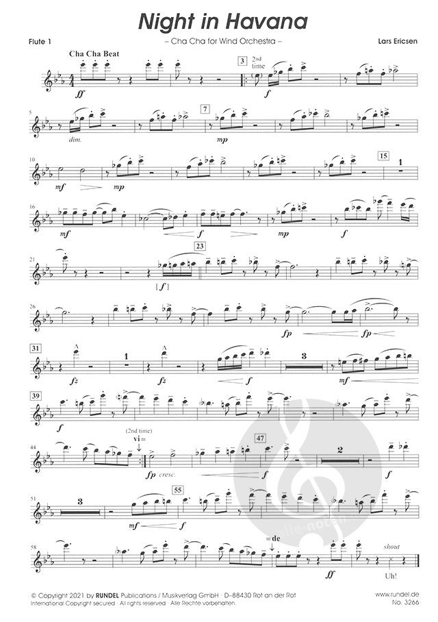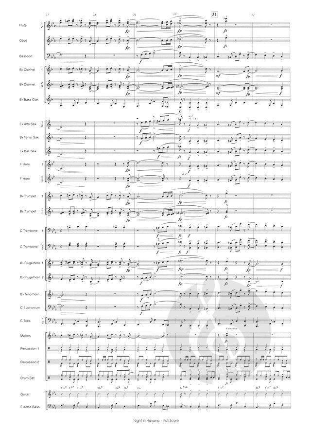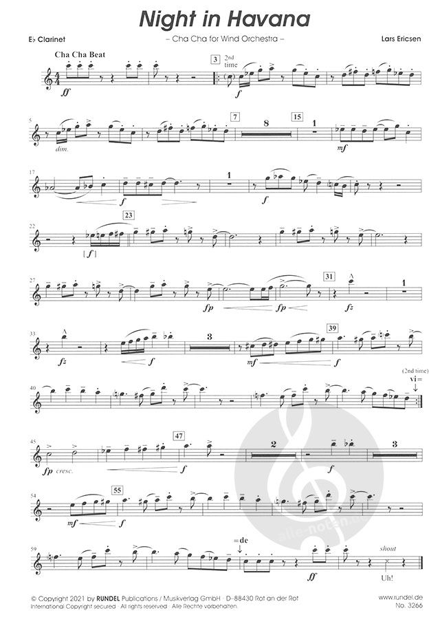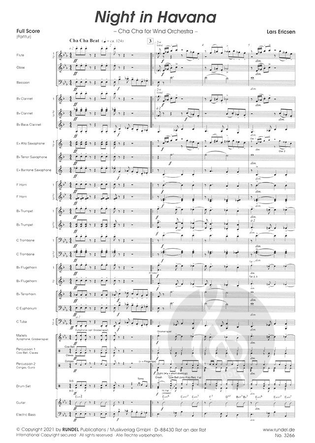 Lars Ericsen hat dem kulturellen Leben dieser Stadt mit seinem Cha-Cha-Cha 'Night in Havana' seine musikalische Reverenz erwiesen. Der erste, versartige Teil der Komposition steht in Moll und schildert den dunklen, morbiden Charme von Havanna mit seinen zum großen Teil verfallenen Straßenzügen. Diese gewissermaßen 'nächtliche' Dunkelheit hellt sich aber gerade des Nachts auf, wenn die Lokale erleuchtet sind und Gäste aus aller Welt bei Live-Musik ihren Tag fröhlich ausklingen lassen. Dies beschreibt der zweite, refrainartige Teil des Stücks in Dur. Zwischen diesen beiden Polen pendelnd, zeichnet 'Night in Havana' ein abwechslungsreiches Bild kubanischer Lebensart. Nur die Zigarre muss hierzulande draußen bleiben ...