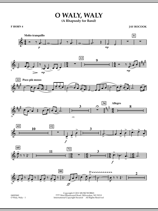 Dating from the 1600s, the folk song O Waly, Waly (commonly known as The Water is Wide) forms the basis for this well-crafted rhapsody for band. The lyrical opening section features solos on flute and euphonium, as a four-note motif common to this song and also Carolina (South Caroline's official song) is developed. This motif unifies the entire work. A Celtic flavored Allegro takes over using this fragment, which leads ultimately to a grand Maestoso section for the entire ensemble. A creative and dynamic work for contest or festival! Dur: 5:00