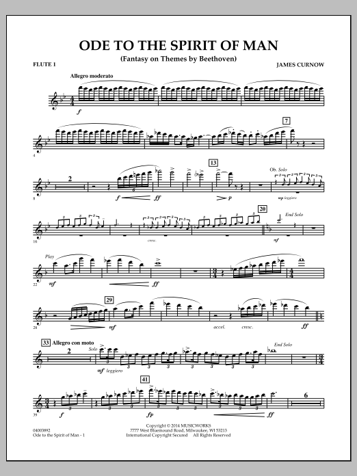 A powerful work for the symphonic band, Ode to the Spirit of Man is based on thematic material taken from the fourth movement of Beethoven's Symphony No. 9 and developed into a fantasy of kaleidoscopic nature. The opening is a joyful expression of the spirit of freedom and is based on the composer's own themes derived from Beethoven's music. Throughout the work, various themes from the symphony are interwoven, including Alla Marcia, Scherzo, Andante maestoso and finally the uplifting Ode to Joy. Dur: 5:15