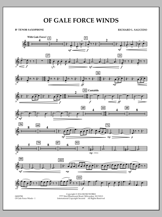The turbulence and intensity of a major wind storm is effectively recreated in Richard Saucedo's Of Gale Force Winds. Based around rhythmic figures that create a wind-like effect, and combined with a playful melody, the piece alternates between 6/8 and 9/8 staying rhythmically dynamic throughout. A very brief moment of repose hints at the period of calm that comes in the middle or 'eye' of bigger storms. The fury of the storm then returns with darker sonorities and increased energy as this descriptive work comes to an exciting conclusion. Dur: 4:00
