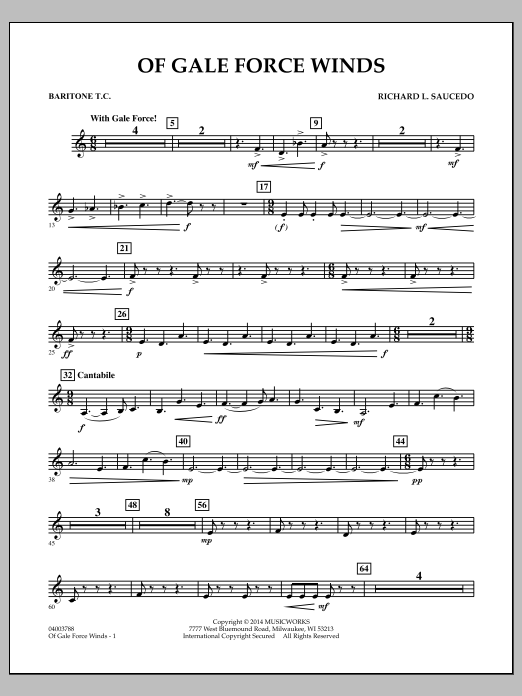 The turbulence and intensity of a major wind storm is effectively recreated in Richard Saucedo's Of Gale Force Winds. Based around rhythmic figures that create a wind-like effect, and combined with a playful melody, the piece alternates between 6/8 and 9/8 staying rhythmically dynamic throughout. A very brief moment of repose hints at the period of calm that comes in the middle or 'eye' of bigger storms. The fury of the storm then returns with darker sonorities and increased energy as this descriptive work comes to an exciting conclusion. Dur: 4:00