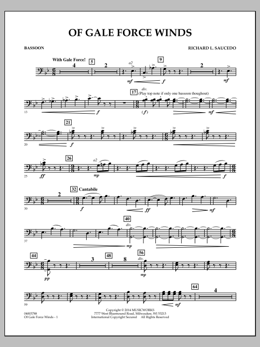 The turbulence and intensity of a major wind storm is effectively recreated in Richard Saucedo's Of Gale Force Winds. Based around rhythmic figures that create a wind-like effect, and combined with a playful melody, the piece alternates between 6/8 and 9/8 staying rhythmically dynamic throughout. A very brief moment of repose hints at the period of calm that comes in the middle or 'eye' of bigger storms. The fury of the storm then returns with darker sonorities and increased energy as this descriptive work comes to an exciting conclusion. Dur: 4:00