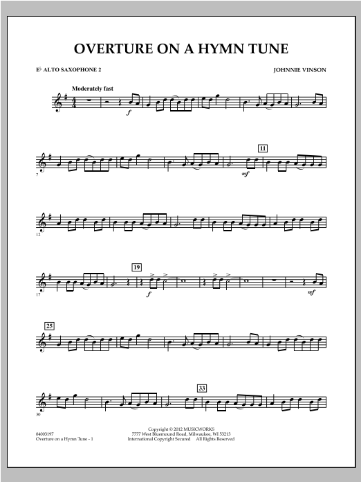 Overture on a Hymn Tune is based on 'The Old Ship Of Zion' which is found in the Early American Sacred Harp songbook. Johnnie Vinson uses a fast-slow-fast overture format to give this wonderful melody an appealing setting with plenty of variety and musicality. The slow middle section is a rhapsodic treatment of the main melody, while the two fast segments offer appealing and upbeat settings sure to be enjoyed by all. Skillfully scored to sound full with inexperienced players. Dur: 3:30