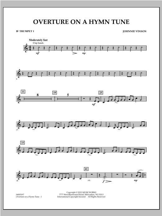 Overture on a Hymn Tune is based on 'The Old Ship Of Zion' which is found in the Early American Sacred Harp songbook. Johnnie Vinson uses a fast-slow-fast overture format to give this wonderful melody an appealing setting with plenty of variety and musicality. The slow middle section is a rhapsodic treatment of the main melody, while the two fast segments offer appealing and upbeat settings sure to be enjoyed by all. Skillfully scored to sound full with inexperienced players. Dur: 3:30