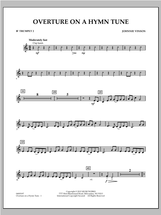 Overture on a Hymn Tune is based on 'The Old Ship Of Zion' which is found in the Early American Sacred Harp songbook. Johnnie Vinson uses a fast-slow-fast overture format to give this wonderful melody an appealing setting with plenty of variety and musicality. The slow middle section is a rhapsodic treatment of the main melody, while the two fast segments offer appealing and upbeat settings sure to be enjoyed by all. Skillfully scored to sound full with inexperienced players. Dur: 3:30