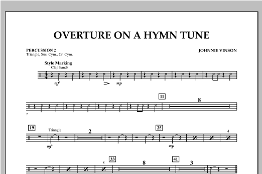 Overture on a Hymn Tune is based on 'The Old Ship Of Zion' which is found in the Early American Sacred Harp songbook. Johnnie Vinson uses a fast-slow-fast overture format to give this wonderful melody an appealing setting with plenty of variety and musicality. The slow middle section is a rhapsodic treatment of the main melody, while the two fast segments offer appealing and upbeat settings sure to be enjoyed by all. Skillfully scored to sound full with inexperienced players. Dur: 3:30