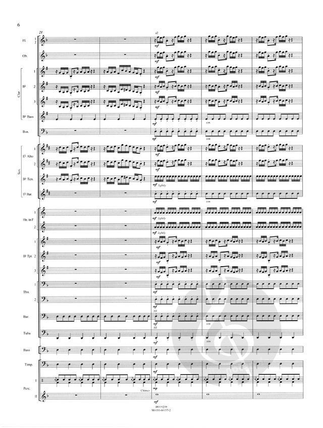 Obwohl diese Komposition so klingt, als stamme sie direkt aus der Barockzeit, handelt es sich bei ihr tatsächlich um den ersten Satz einer Suite, die 1996 von Karl Jenkins geschrieben wurde. Sofort erkennbar als Thema des Werbespots für De Beers-Diamanten, machen sie ihr unerbittlicher Beat und dramatischer Charakter zum idealen Repertoirestück für Bands. Dank Robert Longfields umsichtiger Bearbeitung ist sie nun auch für junge Blasorchester spielbar. 4 Flöte I, 4 Flöte II, 2 Oboe, 4 Klarinette in B I, 4 Klarinette in B II, 4 Klarinette in B III, 2 Bass-Klarinette in B, 2 Fagotte, 2 Es-Alt-Saxophon I, 2 Es-AltSSaxophon II, 2 Tenor-Saxophon in B, 2 Bariton-Saxophon in B, 2 Horn in F I, 2 Horn in F II, 3 Trompete in B I, 3 Trompete in B II, 3 Trompete in B III, 3 Posaune I, 3 Posaune II, 2 Bariton B.