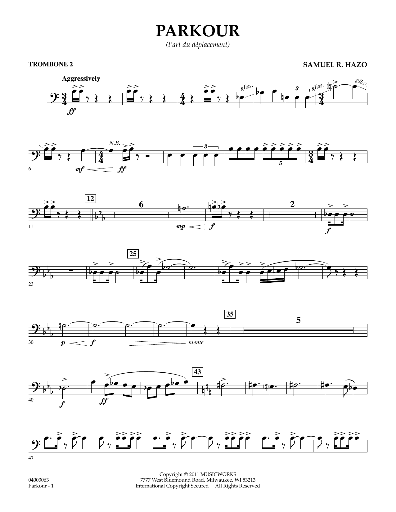 Combining brash and aggressive rhythmic figures along with more gentle moments and inventive textures, this impressive work by Samuel Hazo is truly a standout for advanced bands. The piece is built around a four-note motif, which is developed and expanded throughout. A middle section features more of a jazzy flavor with saxes in the spotlight accompanied by finger snaps. The rhythmic intensity returns, building towards a glorious full ensemble affirmation and bringing this exciting work to a powerful conclusion.