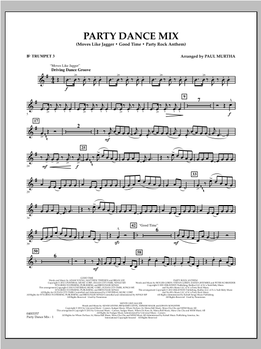 Party Dance Mix' vereint einige der aktuellsten und erfolgreichsten Dance Hits in einem Medley für Blasorchester: 'Moves Like Jagger' (Maroon 5 feat. Christina Aguilera), 'Good Time' (Carly Rae Jepsen) und 'Party Rock Anthem' (LMFAO). Paul Murtha hat die drei Titel effektvoll für Blasorchester im Schwierigkeitsgrad 3 arrangiert.