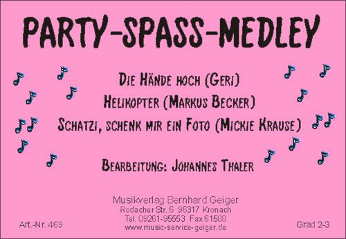 Das neue Party-Spass-Medley 2013 Ideal zum Marschieren oder für die Stimmungsrunde im Zelt. Mit drei top-aktuellen Titeln: 1. Die Hände hoch (Geri, der Klostertaler) 2. Helikopter (Markus Becker) 3. Schatzi, schenk mir ein Foto (Mickie Krause) Arrangement: Johannes Thaler Grad: 2+
