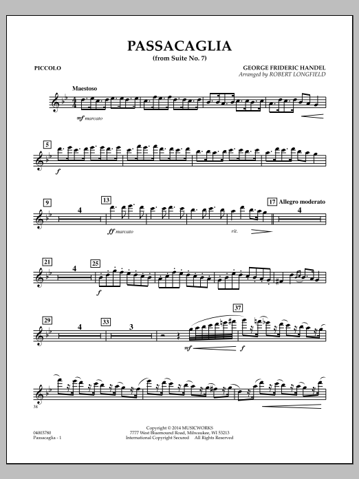 Händels Passacaglia aus der Suite Nr. 7 in g-Moll wurde ursprünglich für Cembalo geschrieben und besteht aus einer Reihe von Variationen über eine sich wiederholende viertaktige harmonische Progression. In dieser meisterhaften Transkription von Robert Longfield dient Händels barockes Kleinod als Vehikel, um die Farben und Klangfarben der modernen Konzertband zu präsentieren. Dauer 4:30