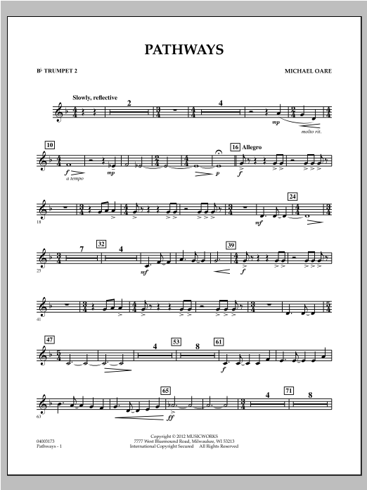Commissioned by the Grassfield High School Band in Chesapeake, Virginia, and dedicated to the graduating class of 2011, the title and nature of this work reference the various pathways chosen, and those yet to be taken, in all of our lives. Michael Oare's rich and expressive composition uses a nice blend of tempos and styles to create a dynamic, well-scored overture for young players. Dur: 4:00