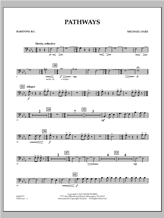 Commissioned by the Grassfield High School Band in Chesapeake, Virginia, and dedicated to the graduating class of 2011, the title and nature of this work reference the various pathways chosen, and those yet to be taken, in all of our lives. Michael Oare's rich and expressive composition uses a nice blend of tempos and styles to create a dynamic, well-scored overture for young players. Dur: 4:00