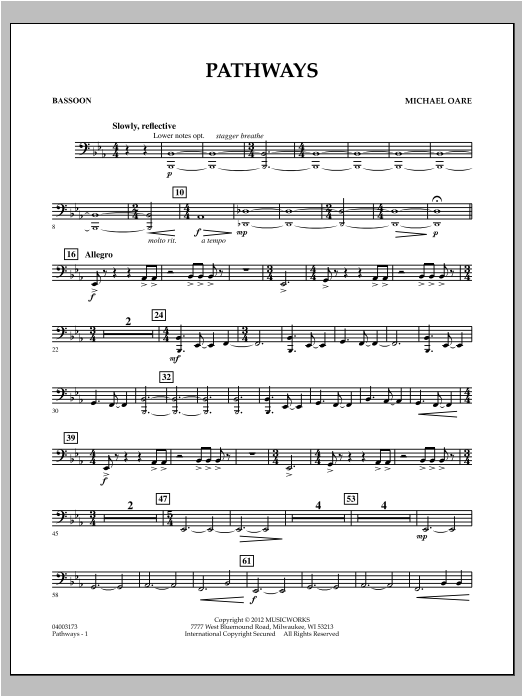 Commissioned by the Grassfield High School Band in Chesapeake, Virginia, and dedicated to the graduating class of 2011, the title and nature of this work reference the various pathways chosen, and those yet to be taken, in all of our lives. Michael Oare's rich and expressive composition uses a nice blend of tempos and styles to create a dynamic, well-scored overture for young players. Dur: 4:00