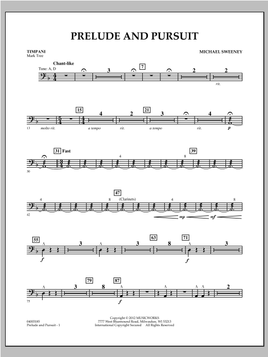 John Barnes Chance composed his landmark work for band, Incantation and Dance, in 1960 while in residence at the high school in Greensboro, North Carolina. Commissioned by the Union County (NC) Honor Band, Prelude and Pursuit pays tribute to this important composition and its North Carolina connection. A haunting chant-like theme played by the clarinets sets the tone for the slow section. Similar to Chance's work, the fast section begins with percussion instruments introducing thematic elements later picked up and developed by the winds. Intensifying rhythmic elements, as well as carefully controlled random playing effects, contribute to an overall sense of excitement and anticipation. Themes are woven throughout various sections of the band before the opening chant motif makes a brief dramatic appearance near the end. A great teaching tool for young players, Prelude and Pursuit also provides a rewarding performance experience. Dur: 4:50
