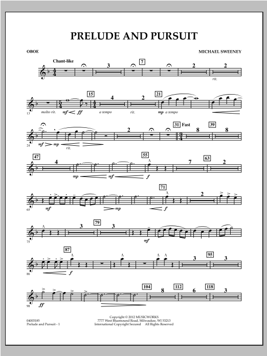 John Barnes Chance composed his landmark work for band, Incantation and Dance, in 1960 while in residence at the high school in Greensboro, North Carolina. Commissioned by the Union County (NC) Honor Band, Prelude and Pursuit pays tribute to this important composition and its North Carolina connection. A haunting chant-like theme played by the clarinets sets the tone for the slow section. Similar to Chance's work, the fast section begins with percussion instruments introducing thematic elements later picked up and developed by the winds. Intensifying rhythmic elements, as well as carefully controlled random playing effects, contribute to an overall sense of excitement and anticipation. Themes are woven throughout various sections of the band before the opening chant motif makes a brief dramatic appearance near the end. A great teaching tool for young players, Prelude and Pursuit also provides a rewarding performance experience. Dur: 4:50